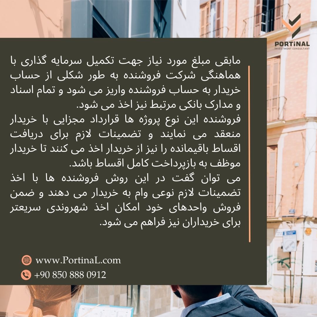 فروشنده این نوع پروژه ها قرارداد مجزایی با خریدار منعقد می نمایند و تضمینات لازم برای دریافت اقساط باقیمانده را نیز از خریدار اخذ می کنند تا خریدار موظف به بازپرداخت کامل اقساط باشد.