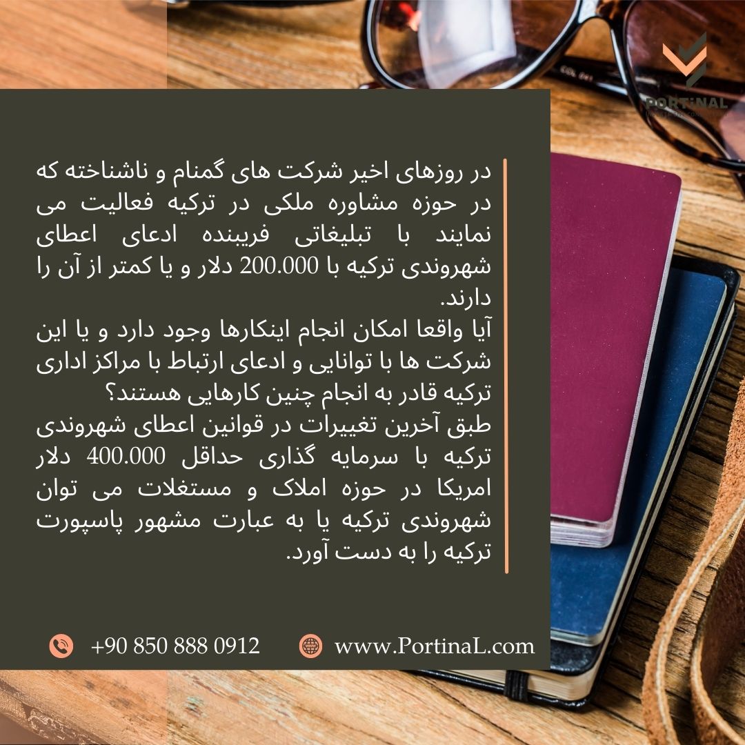 در روزهای اخیر شرکت های گمنام و ناشناخته که در حوزه مشاوره ملکی در ترکیه فعالیت می نمایند با تبلیغاتی فریبنده ادعای اعطای شهروندی ترکیه با 200.000 دلار و یا کمتر از آن را دارند.