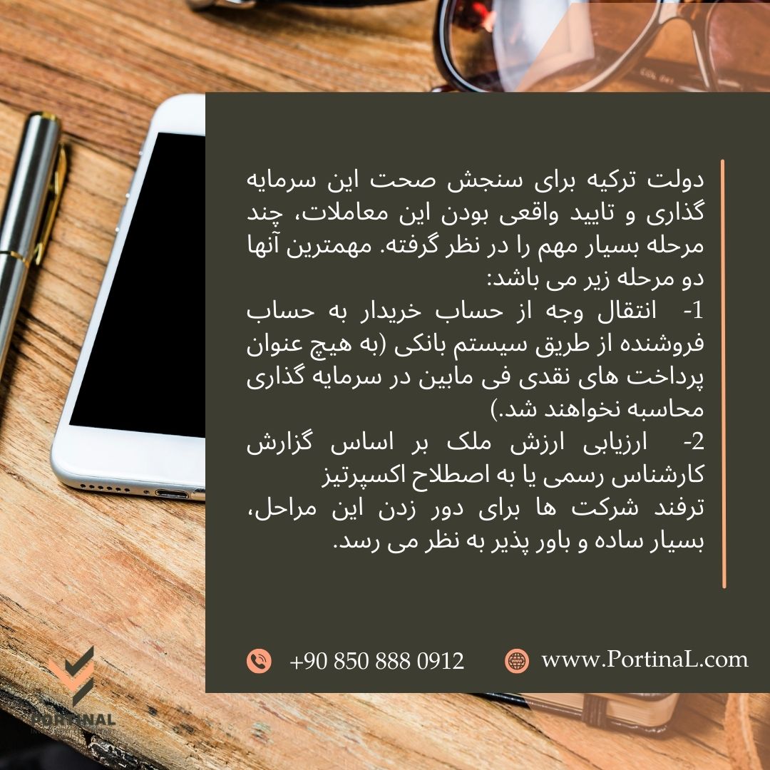 دولت ترکیه برای سنجش صحت این سرمایه گذاری و تایید واقعی بودن این معاملات، چند مرحله بسیار مهم را در نظر گرفته. مهمترین آنها دو مرحله زیر می باشد: