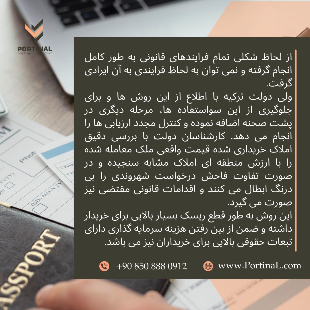 ولی دولت ترکیه با اطلاع از این روش ها و برای جلوگیری از این سواستفاده ها، مرحله دیگری در پشت صحنه اضافه نموده و کنترل مجدد ارزیابی ها را انجام می دهد. کارشناسان دولت با بررسی دقیق املاک خریداری شده قیمت واقعی ملک معامله شده را با ارزش منطقه ای املاک مشابه سنجیده و در صورت تفاوت فاحش درخواست شهروندی را بی درنگ ابطال می کنند و اقدامات قانونی مقتضی نیز صورت می گیرد.