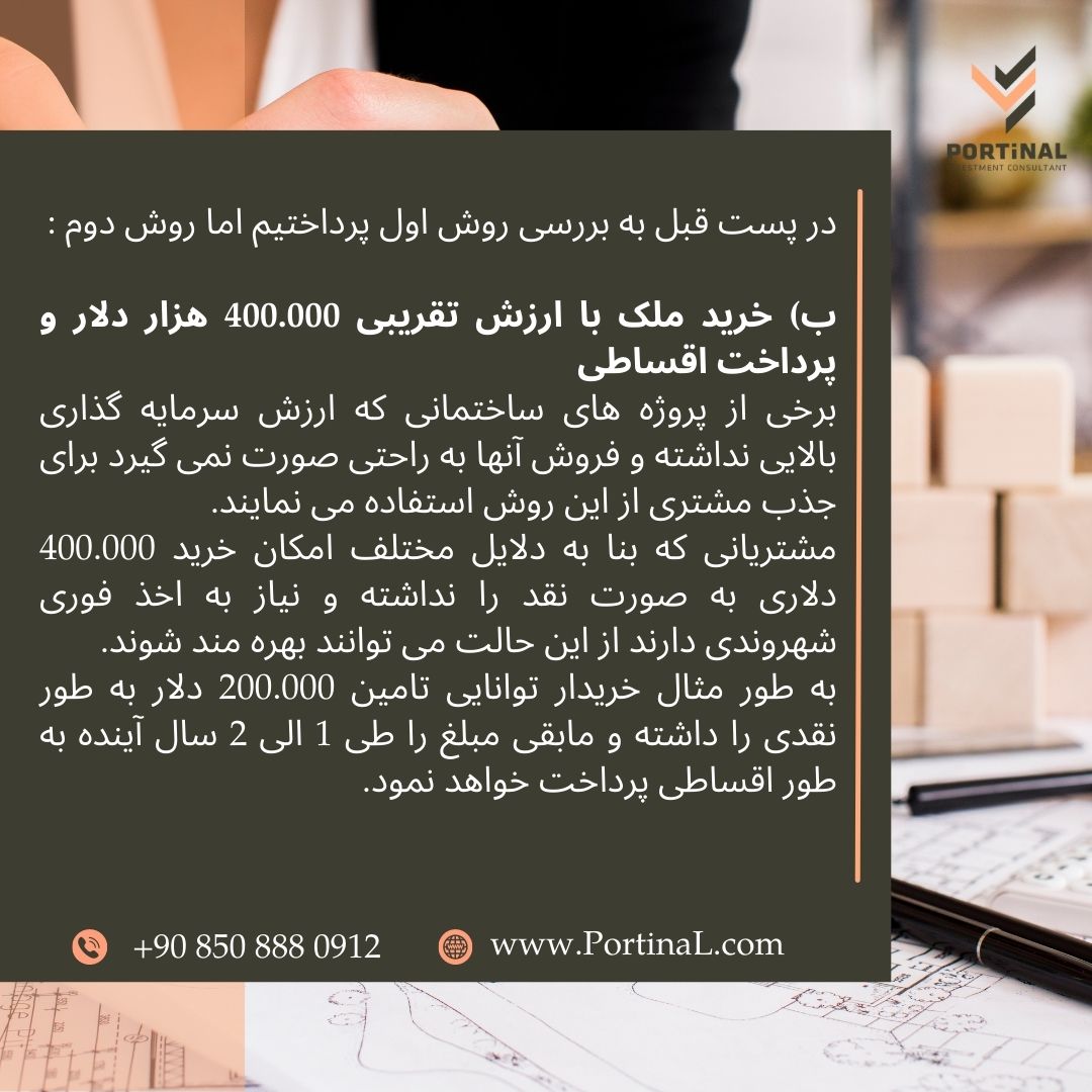 ب) خرید ملک با ارزش تقریبی 400.000 هزار دلار و پرداخت اقساطی